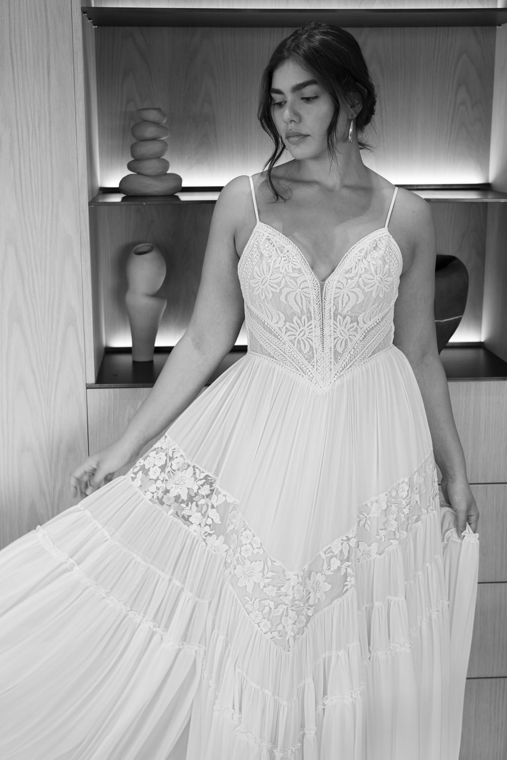 שמלה בסגנון בוהו- שיק. תחרת לאורה היפיפיה, מחשוף קדמי עמוק מותן בזוית מחמיאה.